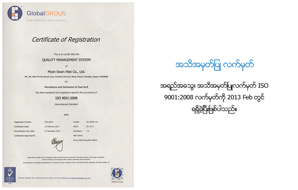 မိရိုးဖလာနည္းမ်ားၿဖင့္ ငါးေမြးၿမဴေနေသာ ေမြးၿမဴသူမ်ားကို ေခတ္မွီစက္သစ္ၾကီးမ်ားၿဖင့္ ထုတ္လုပ္ကာ သိပံၸၸၸနည္းက် ေဖာ္ၿမဴလာမ်ားၿဖင့္ ေဖာ္စပ္ထားၿပီး လိုအပ္ေသာ ဗီတာမင္၊ သတၲဳဓါတ္မ်ားၿဖင့္ထည့္သြင္းထားေသာ ေမြးၿမဴေရးငါး၊ ပုစြန္ အစာေတာင့္မ်ားကို ေကၽြးေမြးၿခင္းၿဖင့္ ရရွိမည့္အက်ိဳးအျမတ္ကို တြက္ခ်က္ေျပာျပ စည္းရံုးၿပီး ေမြးျမဴေရးငါးအစာေတာင့္ကို စတင္အသံုးျပဳလာေအာင္ ကနဦးမိတ္ဆက္ေပးခဲ့ေသာ ကုမၸဏီီျဖစ္ပါသည္။